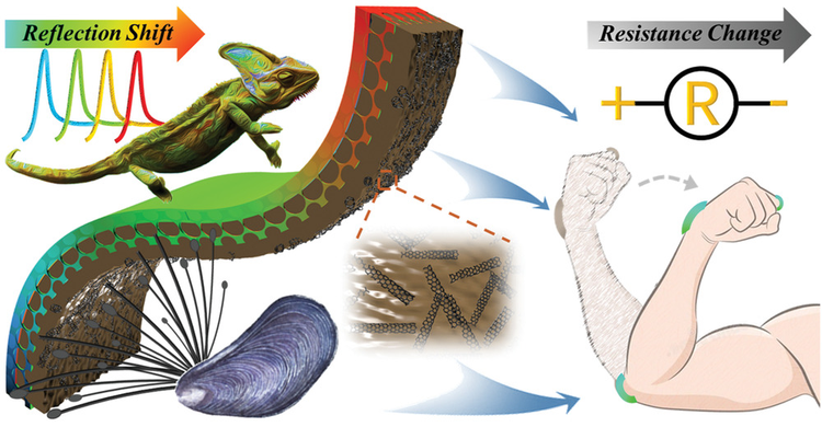最近, 東南大學(xué)趙遠(yuǎn)錦教授在《 Advanced Functional Materials》上發(fā)表了題為“ Bio‐Inspired Stretchable, Adhesive, and Conductive Structural Color Film for Visually Flexible Electronics”的文章,他們從 貽貝的粘附特性和 變色龍的變色機(jī)理出發(fā),提出了一種 新穎的碳納米管-聚多巴胺(PDA)和彈性聚氨酯(PU)聚合物雜化的結(jié)構(gòu)色薄膜,用于可視化柔性電子。他們將導(dǎo)電CNTs-PDA填料引入彈性PU反蛋白石支架中,由于PU層具有良好的柔韌性和反蛋白石結(jié)構(gòu),使其具有穩(wěn)定的拉伸性能和明亮的結(jié)構(gòu)色彩。此外,由于PDA上含有鄰苯二酚基團(tuán),使薄膜具有較高的組織粘附性和自愈能力,CNTs的引入使薄膜具有良好的導(dǎo)電性。該薄膜 在拉伸過程中具有變色和機(jī)電特性,可作為雙信號柔性人體運動傳感器,用于 實時彩色傳感和電信號監(jiān)測。這些特性表明,混合導(dǎo)電結(jié)構(gòu)色薄膜可以提高柔性電子學(xué)的實用價值。