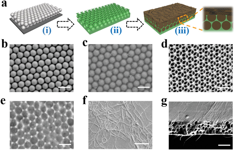 圖1 雜化薄膜的結(jié)構(gòu)與微結(jié)構(gòu)。a) 聚合物導(dǎo)電水凝膠雜化結(jié)構(gòu)色薄膜的形成過程和微觀結(jié)構(gòu)示意圖。(b-g)掃描電子顯微鏡(SEM)圖像b)膠體晶體模板,c)聚氨酯滲透膠體晶體,d)聚氨酯(PU)反蛋白石支架,聚合物導(dǎo)電水凝膠雜化膜的內(nèi)部(e)、表面(f)和橫截面(g)。(i) 指(b);(ii)指(d);(iii)指(e-g)。