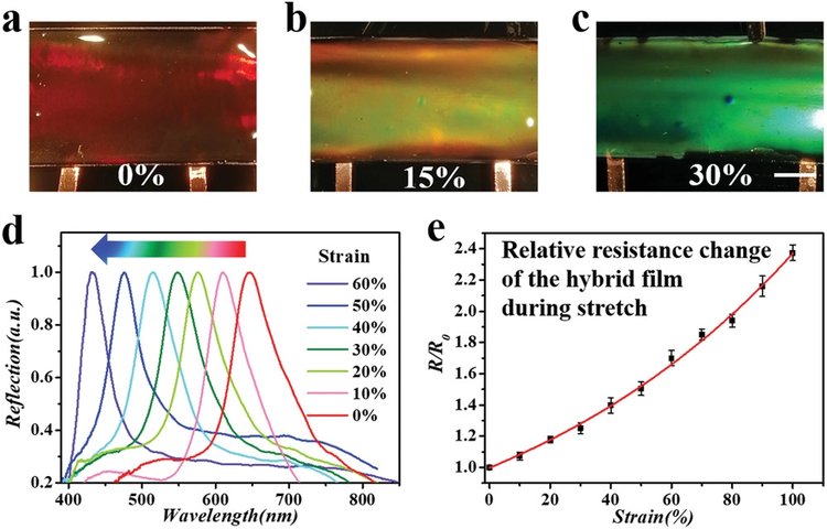 圖2 雜化膜的導(dǎo)電性和顏色感應(yīng)性能。a-c)在a)0%、b)15%和c)30%應(yīng)變下聚合物導(dǎo)電水凝膠雜化結(jié)構(gòu)色膜結(jié)構(gòu)色變化的光學(xué)圖像。d)反射波長與拉伸強(qiáng)度的關(guān)系。e)拉伸薄膜時,相對電阻發(fā)生變化。