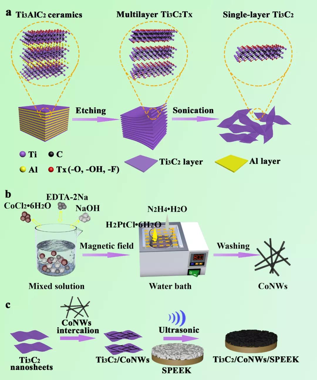 圖1. Ti3C2/CoNWs二維納米異質(zhì)結(jié)及改性PEEK表面示意圖
