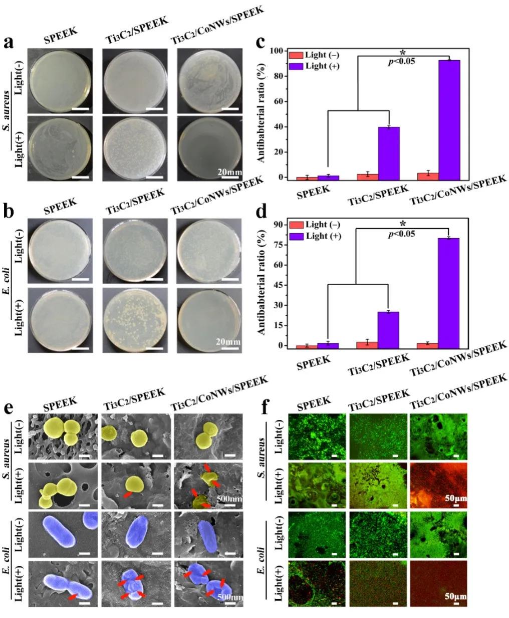 Ti3C2/CoNWs涂層在近紅外光觸發(fā)下產(chǎn)生的光熱和光動(dòng)力學(xué)效應(yīng)可以在20分鐘內(nèi)對(duì)革蘭氏陽(yáng)性金葡萄球菌/革蘭氏陰性大腸桿菌就行殺滅,達(dá)到90%以上的抗菌效果(圖2)。此外,體外細(xì)胞實(shí)驗(yàn)結(jié)果表明異質(zhì)結(jié)具有較好的細(xì)胞相容性。綜上所述,該新型MXene/CoNWs生物異質(zhì)結(jié)涂層賦予了PEEK植入體優(yōu)異的雙重光熱/光動(dòng)力協(xié)同抗菌特效,大大拓寬了PEEK植入體在感染性骨缺損修復(fù)領(lǐng)域的臨床應(yīng)用,避免了抗生素耐藥菌的科學(xué)難題。